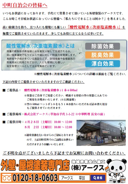 ご近隣の方々に除菌効果が高い次亜塩素酸水の無償配布を行いました。