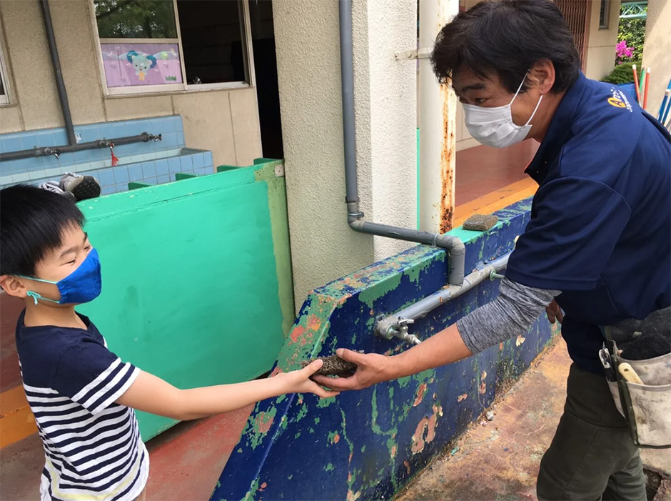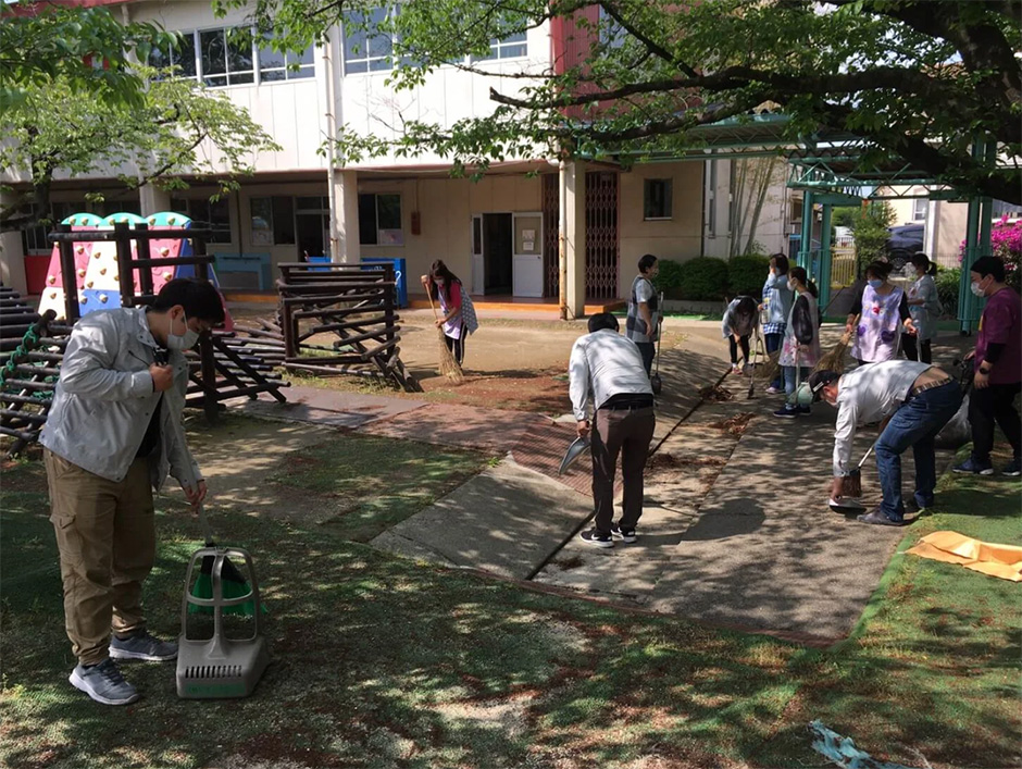 5/1 草加市の幼稚園にて、地域活動を行いました。 今回は園内の清掃・園内の水道場の塗装をさせていただきました。 まず清掃を始める前にきちんと次亜塩素酸水で除菌しました