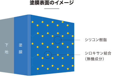一般的なシリコン塗料と比較して、劣化に強い「無機成分」を豊富に配合。樹脂同士が強固に結びつき、緻密で強靭な塗膜を形成するため、紫外線に対して優れた耐候性を発揮。