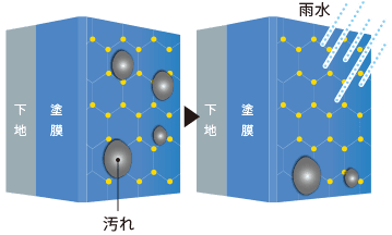 親水性 (水になじみやすい性質)により、塗膜に汚れが付着しても、汚れの間に水が入り込み、汚れを洗い流す。