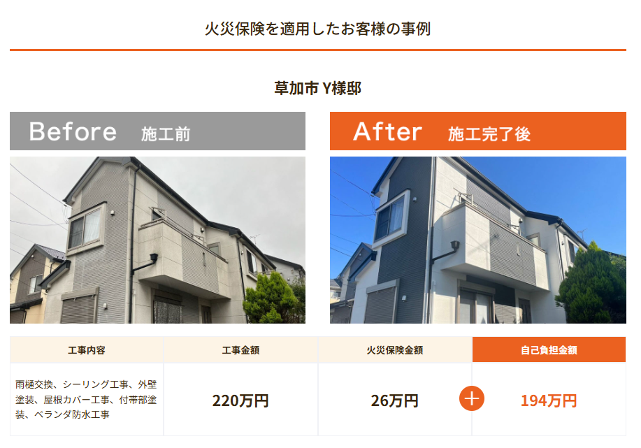 この事例では、屋根かの排水管と軒先の雨どいの損傷に対して火災保険が認められ、全体費用220万円のうち26万円が補償され、10%以上の出費を抑えることができました。